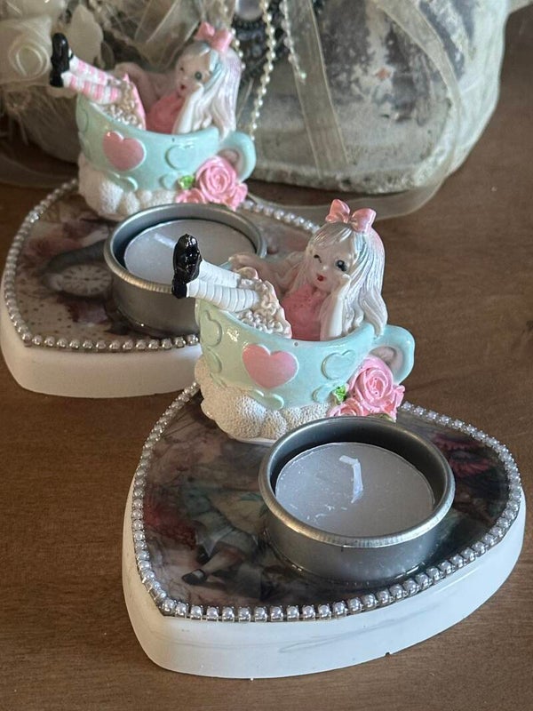 Cette création délicate capture toute la magie d’un monde enchanté : une figurine rêveuse installée dans une tasse ornée de cœurs et de roses, posée sur un socle en forme de cœur décoré de perles. Le design raffiné, agrémenté de détails vintage comme une montre à gousset et des motifs victoriens, évoque un univers hors du temps où l’imaginaire prend vie.