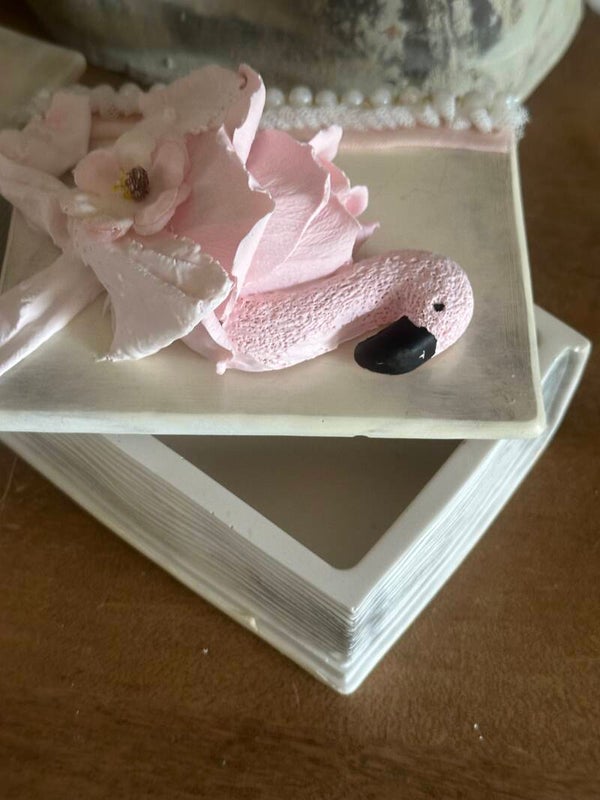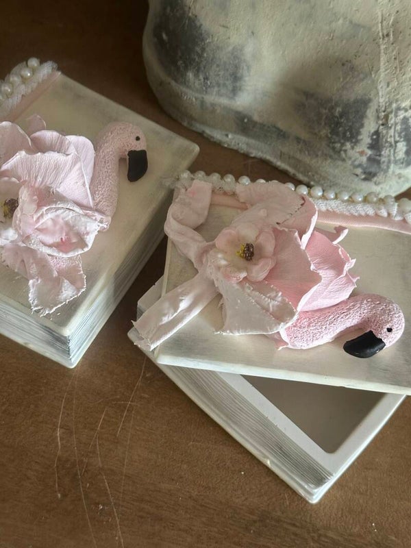 Ajoutez une touche d’élégance romantique à votre décoration avec cette magnifique boîte-livre inspirée du style shabby chic. Entièrement décorée à la main, elle arbore un délicat flamant rose en relief, accompagné de fleurs en tissu dans des tons pastel. Des perles et de la dentelle subliment les bords, ajoutant une touche raffinée et vintage.