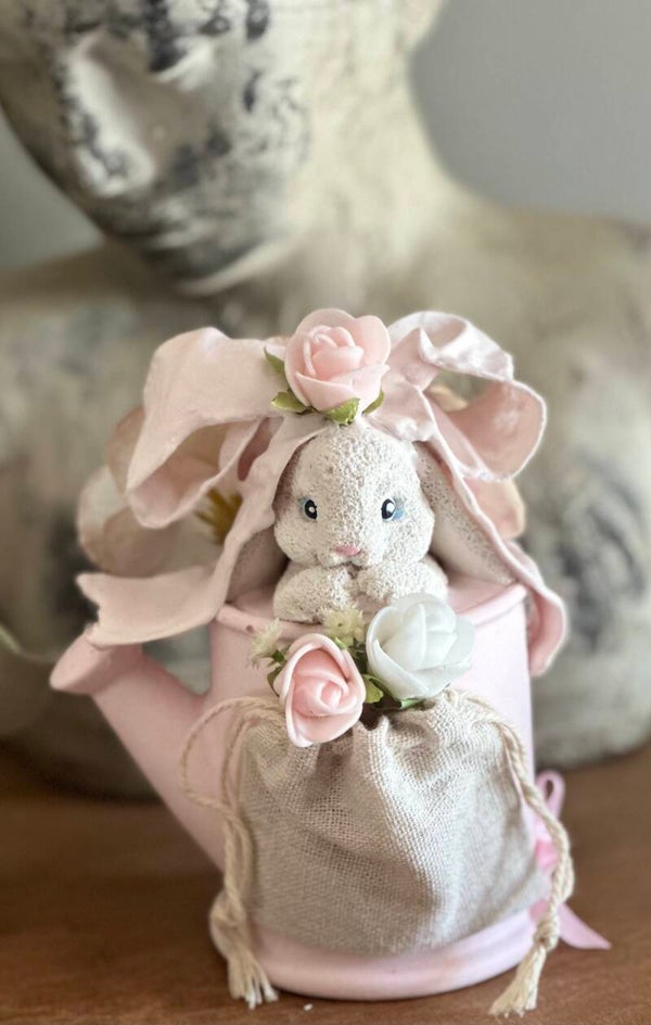Ses longues oreilles, nouées d’un ruban poudré, flottaient dans l’air, comme si elles chuchotaient des histoires oubliées aux fleurs qui dansaient autour de lui. Cette petite merveille semble tout droit sortie d’un conte, prête à insuffler une touche de féerie à votre intérieur.
