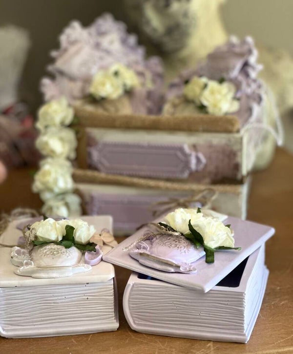 Laissez-vous séduire par cette collection pleine de charme et de poésie. Plateau décoratif, faux livre cachette, cadres assortis et caissettes vintage s’harmonisent à merveille pour créer une ambiance douce et raffinée.