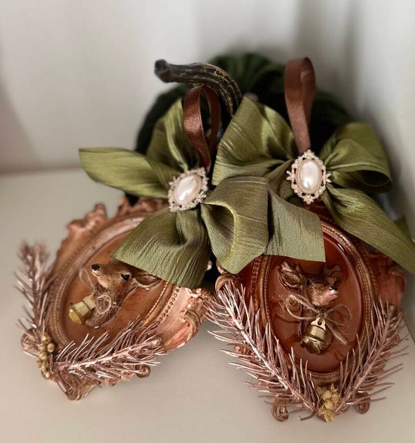 Chaque détail compte : médaillon en relief orné d’une tête de cerf, feuillage bronze, grelot doré et majestueux nœud vert orné d’un camée perlé vintage.