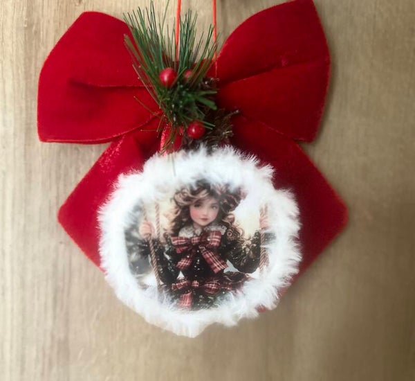 Décoré d’un grand nœud rouge, de baies et de verdure, il se transforme en suspension raffinée à accrocher au sapin ou dans la maison.
