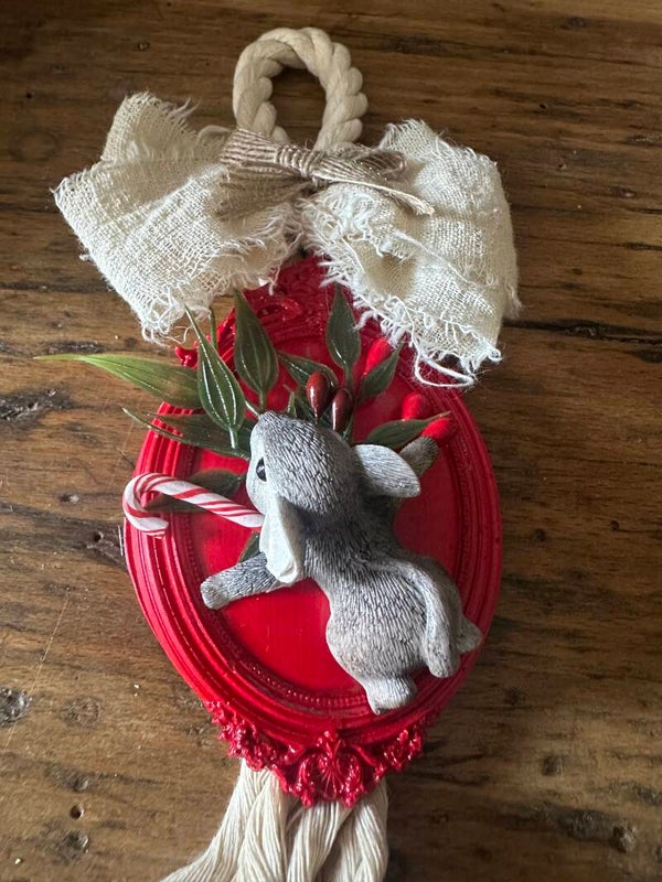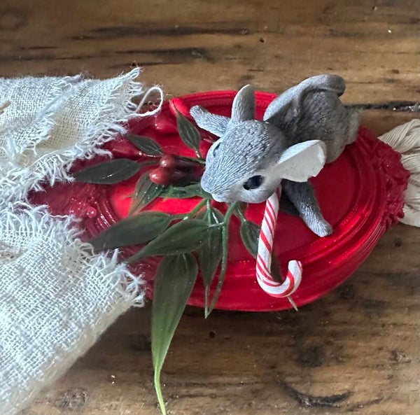 Sur un cadre rouge lumineux, une petite souris grise se faufile entre feuillages, baies d’hiver et canne de sucre. Le large nœud de lin et la tresse en coton naturel apportent une élégance bohème, parfaite pour la saison.