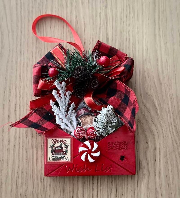- Création unique : une enveloppe rouge “Wish List” garnie de mini pommes de pin, de branches enneigées, de baies rouges et d’un ruban en tartan rouge et noir.