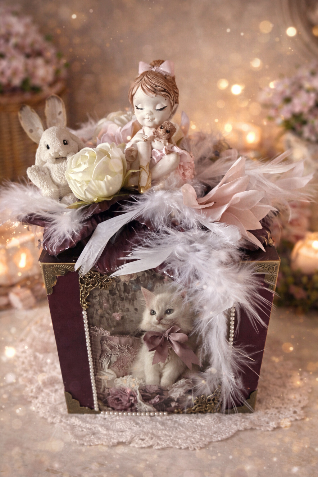 Comme sorti d’un conte enchanté, ce coffret décoratif réunit une délicate petite fée, un adorable lapin et un chaton plein de tendresse. Entourés de fleurs délicates, de plumes légères et de nuances poudrées, ils créent une scène douce et poétique qui semble suspendue dans le temps.