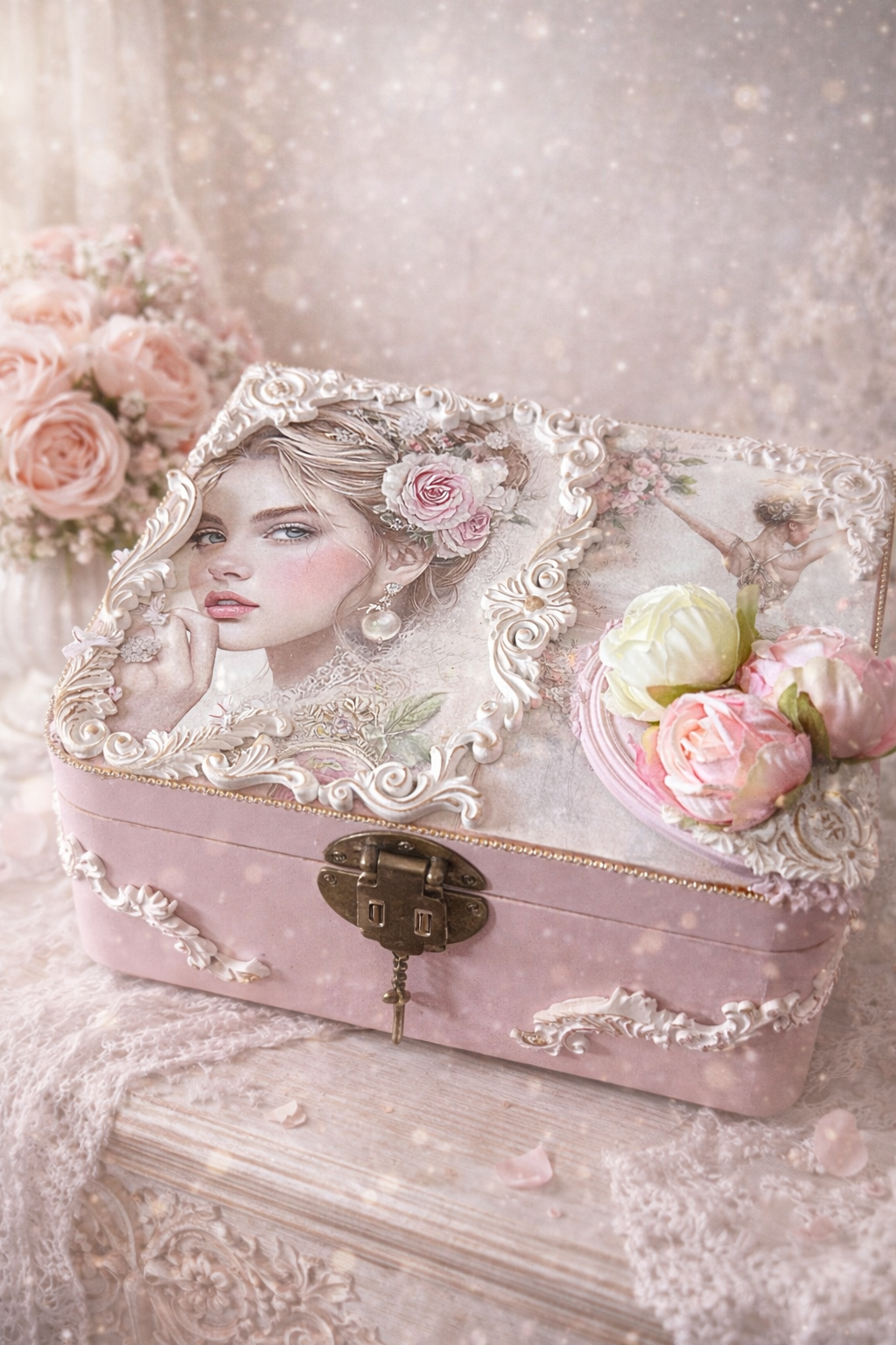Comme un trésor délicatement oublié dans un boudoir ancien, ce coffret semble renfermer des secrets doux et précieux…